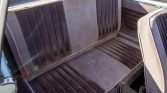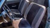 The cabin features front bucket seats and a rear bench upholstered in gray cloth with black inserts as well as matching door panels and gray carpets. Additional equipment includes a body-color dashboard, an aftermarket shifter, manual-crank windows, and square-weave floor mats.