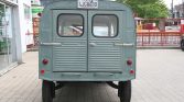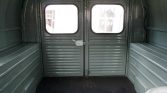 The vehicle is said to have been repainted some time during previous ownership and is finished in gray-green. Exterior features include a front bumper with overriders, front mudguards, dual side windows, and ambulance-style rear doors.