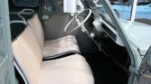 The cabin features removable metal-frame seats trimmed in striped fabric with tan door panels and black rubber-lined floors. Features include a push/pull gear selector and folding side windows.