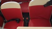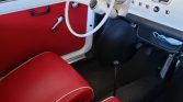 The cabin features seats reupholstered in red vinyl with white piping as well as matching door panels, a body-color dashboard, and black carpets and floor mats. Equipment includes manual wind-up windows, vent windows, and a storage compartment beneath the dashboard. The floorboards were replaced during the refurbishment.