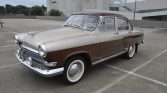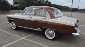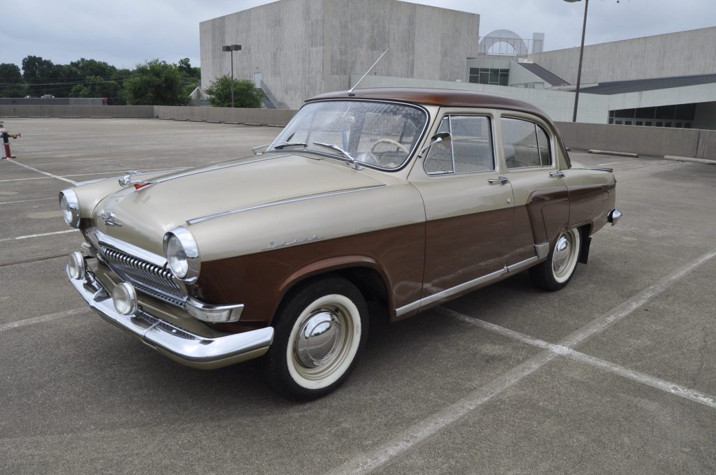 The GAZ-21 was manufactured in the Soviet Union, and the third series was updated to include a new “baleen” front grille, a vinyl headliner, and an optional radio. This example is a Lux edition, which includes additional bright trim and fog lamps, and was repainted in its current tan and brown in Russia prior to being imported into the US.