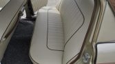 The cabin features cream vinyl upholstery with brown piping along with salt-and-pepper carpeting throughout. Equipment includes a column-mounted shifter, cruise control, a period radio, an analog clock, and a front bench seat that can be adjusted to lie flat.