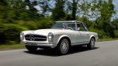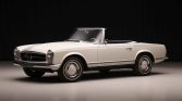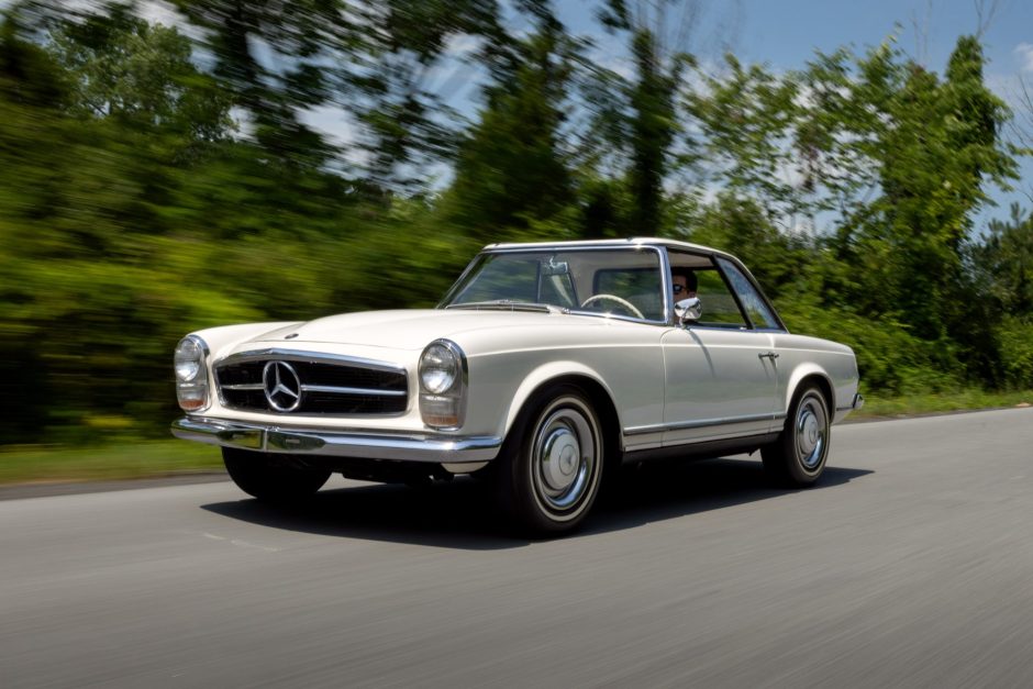 This 1967 Mercedes-Benz 230SL is finished in white over black MB-Tex upholstery and powered by a 2.3-liter inline-six paired with a four-speed automatic transmission. The car is equipped with a body-color removable hardtop, a black soft top, a Blaupunkt push-button radio, lap belts, power-assisted front disc brakes, and 14″ wheels with chrome-accented caps.
