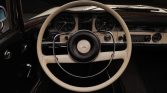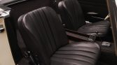 The cabin features bucket seats upholstered in black MB-Tex with charcoal carpets and wood trim atop the dashboard. Appointments include an analog clock, a Blaupunkt push-button radio, and aftermarket lap belts.