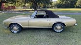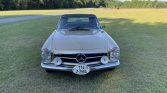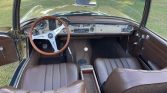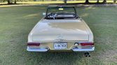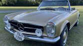 This 1967 Mercedes-Benz 250SL is finished in gold over brown MB-Tex and is powered by a 2.5-liter inline-six paired with a four-speed manual transmission. Equipment includes a brown convertible top, a removable hardtop, power steering, Hella driving lamps, 14″ steel wheels with painted covers, a Nardi steering wheel, a RetroSound Bluetooth radio, and a heater.