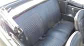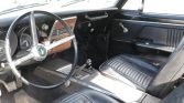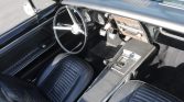 A black monochromatic treatment is carried throughout the interior, including the bucket seats and rear bench that are covered in replacement upholstery. The car is equipped with a center console as well as a woodgrain-trimmed center stack containing Declo AM radio.