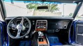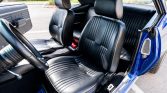 The cabin houses replacement Procar front bucket seats and a rear bench upholstered in black vinyl along with coordinated carpets and woodgrain trim accents. Appointments include a center console, Vintage Air climate control, a Custom Autosound stereo, and blue-accented floor mats. An alarm system with remote key fobs is installed.