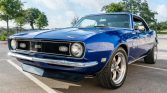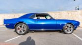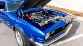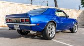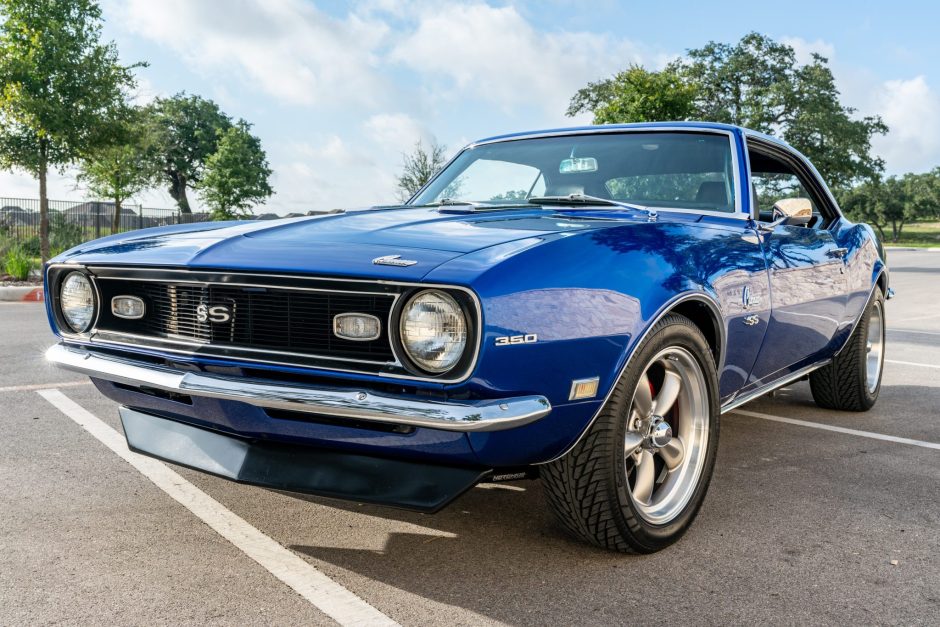 This 1968 Chevrolet Camaro coupe was refurbished and modified during the prior ownership. The body has been refinished in metallic blue, the interior has been fitted with Procar bucket seats trimmed in black vinyl, and a modified 350ci V8 has been installed along with a Tremec five-speed manual transmission. The chassis features Hotchkis suspension components, bolt-in subframe connectors, and Wilwood disc brakes, while additional modifications include an alarm system, Vintage Air climate control, AutoMeter gauges, an Edelbrock intake manifold, a Proform four-barrel carburetor, aluminum cylinder heads, full-length exhaust headers, and MSD ignition components.