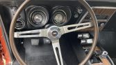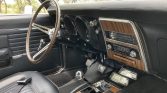 The dual front bucket seats and rear bench were reupholstered in black vinyl (712) with a matching dashboard, door panels, headliner, and carpeting. Interior materials were sourced from Legendary Auto Interiors of Newark, New York. The console and center stack feature woodgrain trim, and additional amenities include lap belts all around, a Delco AM radio that has been modified for AM/FM stereo capability, an added rear speaker, and a chrome Muncie shift lever.