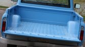The cabin features steel surfaces painted in Light Blue along with a bench seat upholstered in blue vinyl with a matching dash pad, lap belts, and door panels. Equipment includes a rubber floor liner, chrome sill plates, a defroster and heater, two-speed wipers, and a push-button radio.