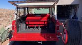 The 15″ slotted alloy wheels are mounted with 235/75 Michelin LTX M/S² tires, and a matching spare is affixed to a swing-away rear carrier. The truck is equipped with manually locking front hubs, and stopping power is provided by power-assisted front discs and rear drums. The suspension was overhauled and dual shock absorbers were added during the refurbishment.