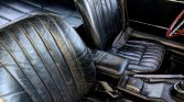 The cabin features bucket seats trimmed in black leather along with matching door panels and carpets. Features include a Jensen cassette player, Pioneer speakers, and lap belts. The seat bottoms were repaired by Styles Upholstery of Victoria, British Columbia, in January 2019.