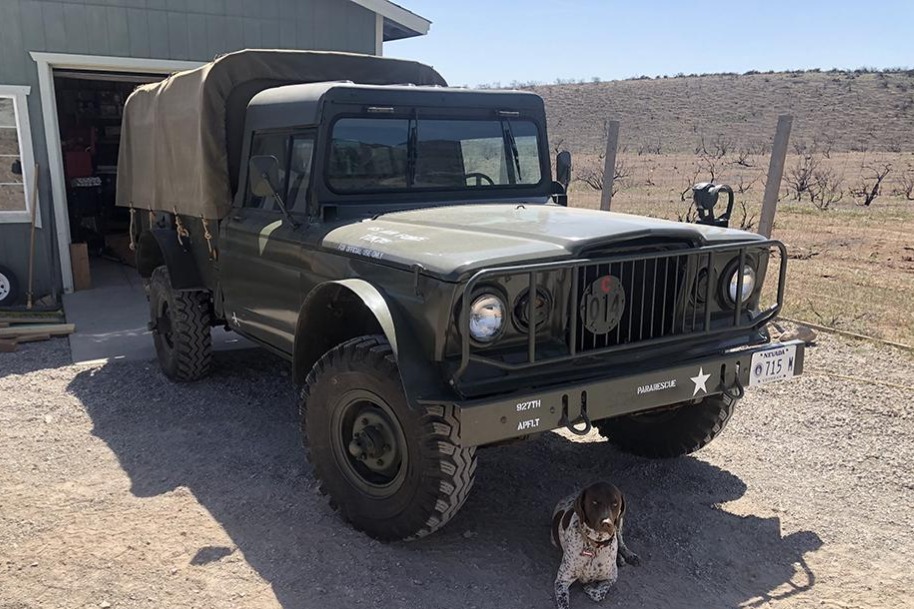 This 1968 Kaiser Jeep M715 was reportedly delivered new to the US Air Force and was acquired by the seller in 2019. The truck is finished in olive drab over black vinyl upholstery, and power comes from a replacement 258ci inline-six paired with a Warner T-98 four-speed manual transmission and a two-speed transfer case. Features include a canvas bed cover, a jerry can and tools, and an M101A1 trailer.