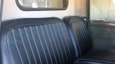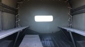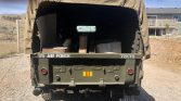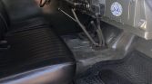 The cabin features steel surfaces finished in olive drab and features twin bucket seats trimmed in black vinyl. Military operating plaques are affixed to the dashboard, and rubber floor mats are fitted.