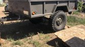 The M101A1 trailer is finished in olive drab and features a canvas top.