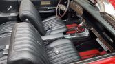 The seating surfaces are upholstered in black vinyl with faux wood trim accenting the matching dashboard and door panels. Amenities include an eight-track player, front bucket seats, and a center console with a floor-mounted shifter.