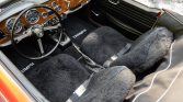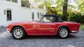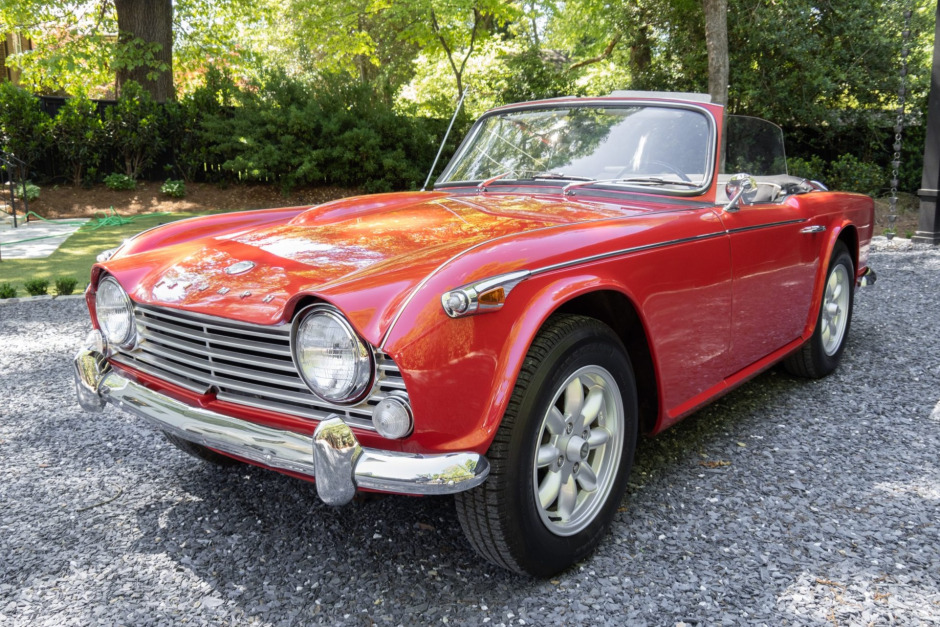 This 1968 Triumph TR4A IRS was purchased new in Tennessee and was acquired by the seller in 2015, reportedly from the estate of its original owner. The car is finished in red over black leather and powered by a 2,138L inline-four paired with a four-speed manual transmission with overdrive. Equipment includes independent rear suspension, dual SU carburetors, 15″ Minilite wheels, and a luggage rack. Work carried out during current ownership included installing a replacement transmission and clutch, a stainless steel exhaust, a black Robbins canvas top, and a carpet kit.