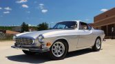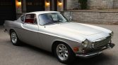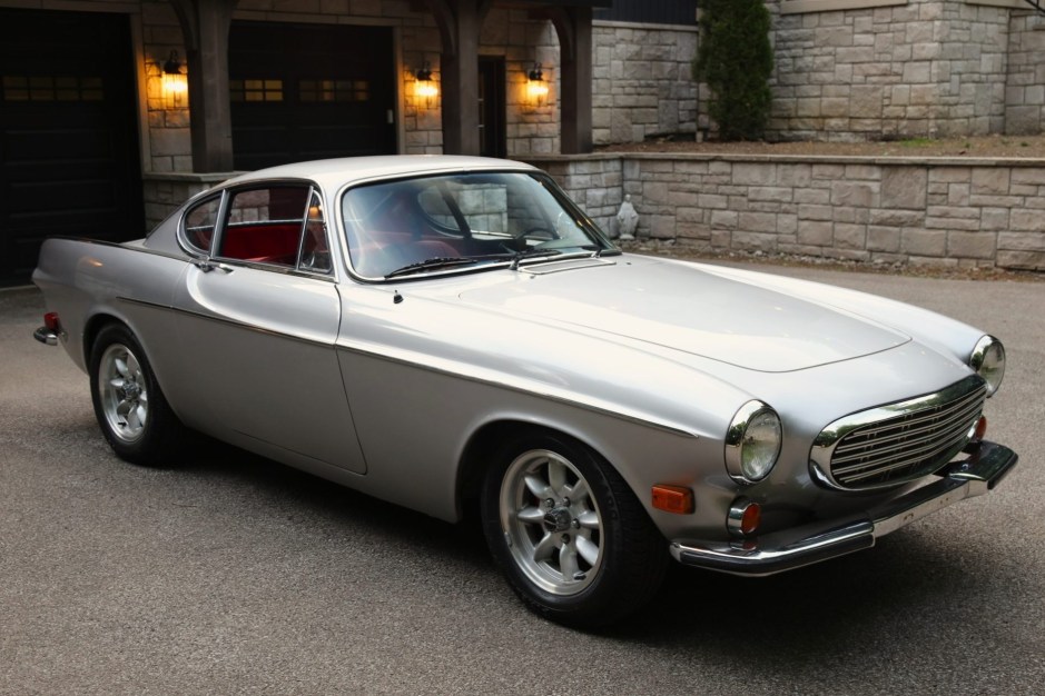 This 1968 Volvo 1800S is powered by a replacement 2.0-liter B20 inline-four mated to a four-speed manual transmission with overdrive, and it wears a repaint in silver over a red interior. Equipment includes dual carburetors, K&N air-filter assemblies, an aftermarket exhaust system, 15″ Minilite-style wheels, a crosshatch grille, chrome trim, four-wheel disc brakes, front bucket seats, a Volvo-branded radio, flow-through ventilation, and a heater.