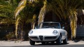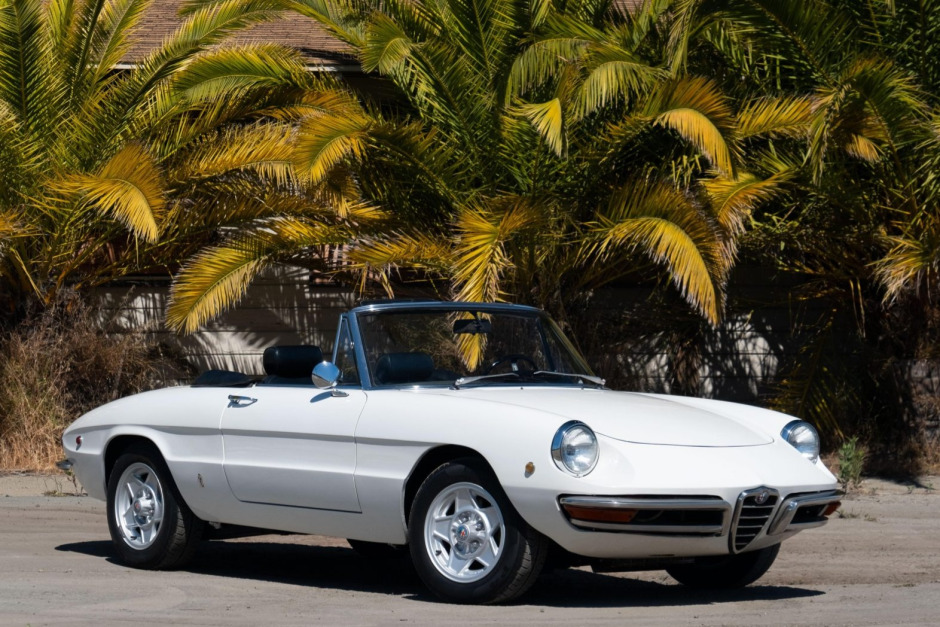 This 1969 Alfa Romeo Spider was acquired out of Texas in 2017 by the current owner, who commissioned a refurbishment that was completed in California by 2018. Work included refinishing the exterior in white, installing a black canvas soft top, reupholstering the black interior, and installing a rebuilt 2.0-liter twin-cam inline-four with SPICA mechanical fuel injection. The five-speed manual transmission was also rebuilt, and subsequent work has consisted of refinishing the 14″ Cromodora wheels, servicing the brakes, and replacing the clutch assembly, shocks, and suspension bushings.