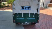 The beige canvas top has been patched and is tied down over removable cover bows. A spare tire and jerry can are mounted in the bed, and the wooden bed floor has been painted black and fitted with stainless steel hardware.
