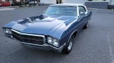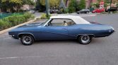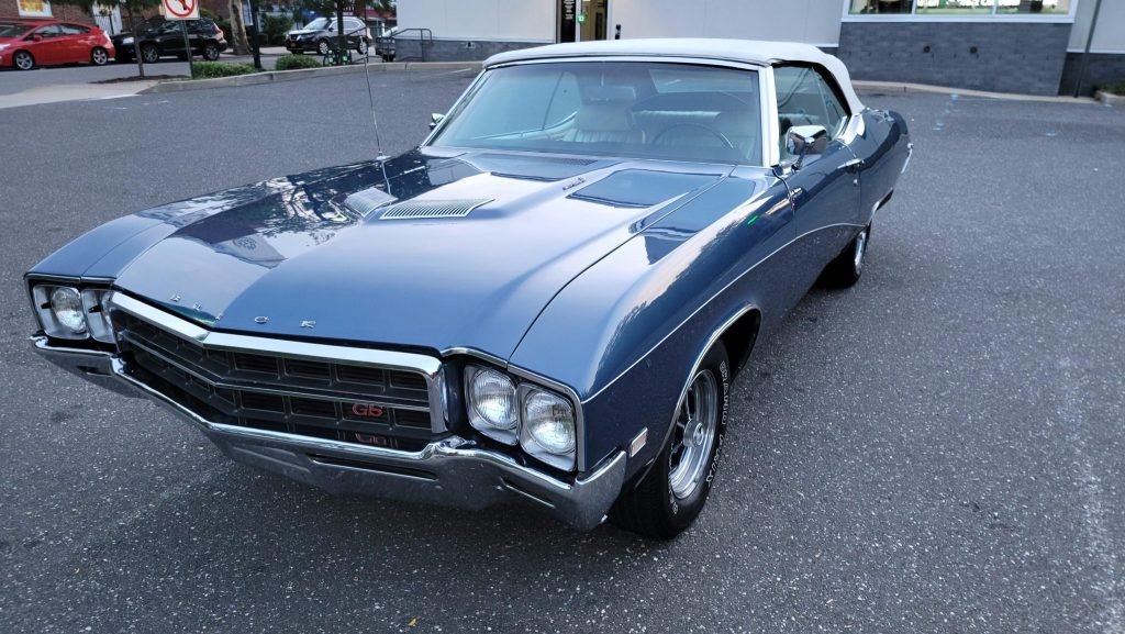 This 1969 Buick GS 400 Stage 1 convertible is finished in blue over white upholstery and powered by a 400ci V8 paired with a three-speed automatic transmission and a limited-slip differential. Equipment includes a white soft top, Ram-Air induction, a “horseshoe” shifter, 14″ Rally wheels, and a factory AM radio. It was acquired by the seller in 2008 and subsequently underwent a mechanical and cosmetic refurbishment.