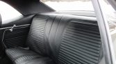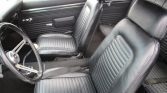 The cabin features front bucket seats and a rear bench trimmed in black with a matching dash, door panels, and carpeting. Additional interior appointments include lap belts, faux wood trim on the dash, manual windows, a Hurst shift lever, and a push-button AM radio.