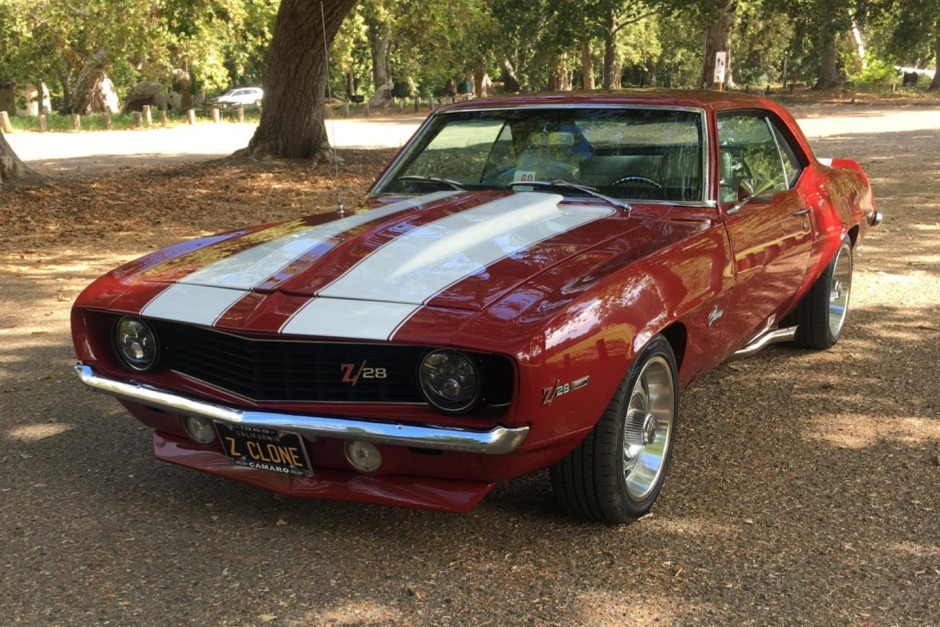 This 1969 Chevrolet Camaro coupe was refurbished and modified in the style of a Z/28 approximately 18 years ago before it was purchased by the seller in 2017. The car is finished in red with white stripes over white vinyl upholstery, and power comes from a replacement 350ci Chevrolet ZZ4 V8 paired with a Tremec six-speed manual transmission and a 10-bolt Posi-traction rear end with a 3.73:1 final drive. Equipment includes FiTech electronic fuel injection, MSD electronic ignition, staggered-width Rally-style wheels, a hydraulic clutch, Wilwood four-wheel disc brakes, a TCI four-link rear suspension kit, Ridetech tubular control arms, Ridetech adjustable shocks, dual side-exit exhausts, a Hurst shifter, and an Alpine CD player with Bluetooth.