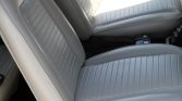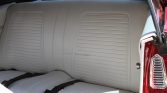 The cabin features bucket seats with headrests that were reupholstered in white under previous ownership, along with a matching rear bench and door panels. Sound insulation is said to have been fitted under the black carpets, and equipment includes lap belts, a Hurst shifter, and a custom stereo with an Alpine CD player, a trunk-mounted amplifier, and subwoofers.