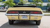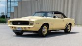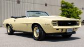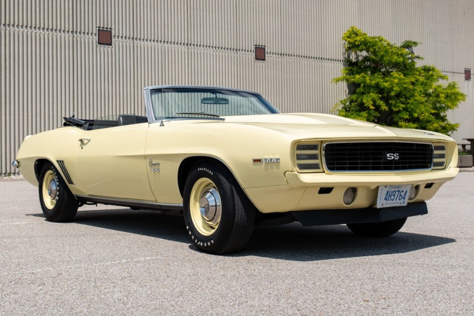 This 1969 Chevrolet Camaro SS convertible is powered by a replacement 396ci Turbo-Jet V8 paired with a four-speed manual transmission. Features include a 2.73:1 Positraction differential, a replacement black convertible soft top, 14″ steel wheels with hubcaps, power-assisted steering, retractable headlights, an Enduro-style front bumper, an AM/FM radio, Deluxe interior trim, power windows, and a cabin heater.