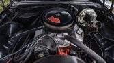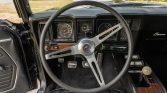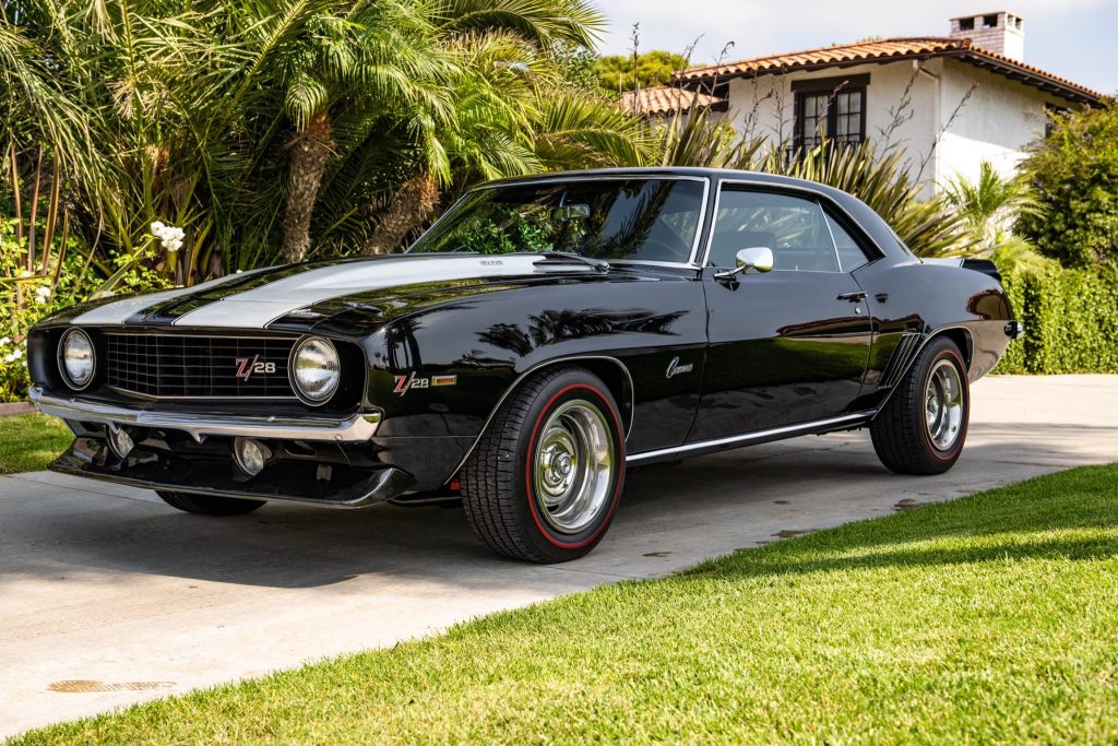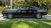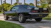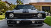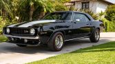 This 1969 Chevrolet Camaro Z/28 coupe is powered by a replacement 327ci V8 paired with a four-speed manual transmission. Equipment after refurbishment includes a Holley carburetor, a Positraction rear end, power steering, power brakes, Hedman exhaust headers, a Hurst shifter, and a Kenwood stereo. Finished in black with white stripes over a black interior, the car was produced at GM’s Norwood, Ohio facility.