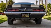 The car has been refinished in black with dual white stripes. Features include front and rear spoilers, a cowl-induction hood, dual chrome side mirrors, chrome bumpers, dual exhaust outlets, and Z/28 badging.