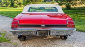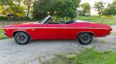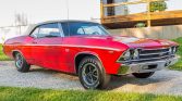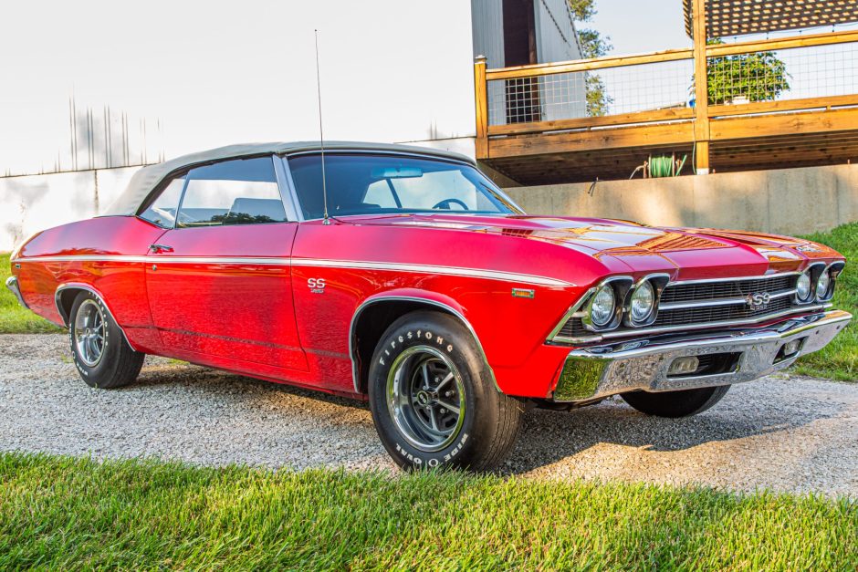 This 1969 Chevrolet Chevelle SS convertible is finished in red over black vinyl and is powered by a 396ci V8 paired with a three-speed automatic transmission. Equipment includes a white convertible top, a Super Sport hood and wheels, power front disc brakes, a black vinyl convertible top boot, power steering, a push-button AM radio, and a Positraction rear differential. The vehicle has spent time in Arizona and Kansas and was acquired by the seller in 2011.