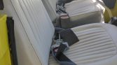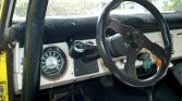 The cabin features white vinyl seats along with contrasting black carpets and door panels. Equipment includes a six-point roll cage, aftermarket racing-style lap belts, and a wooden shift knob.