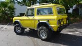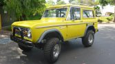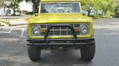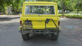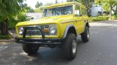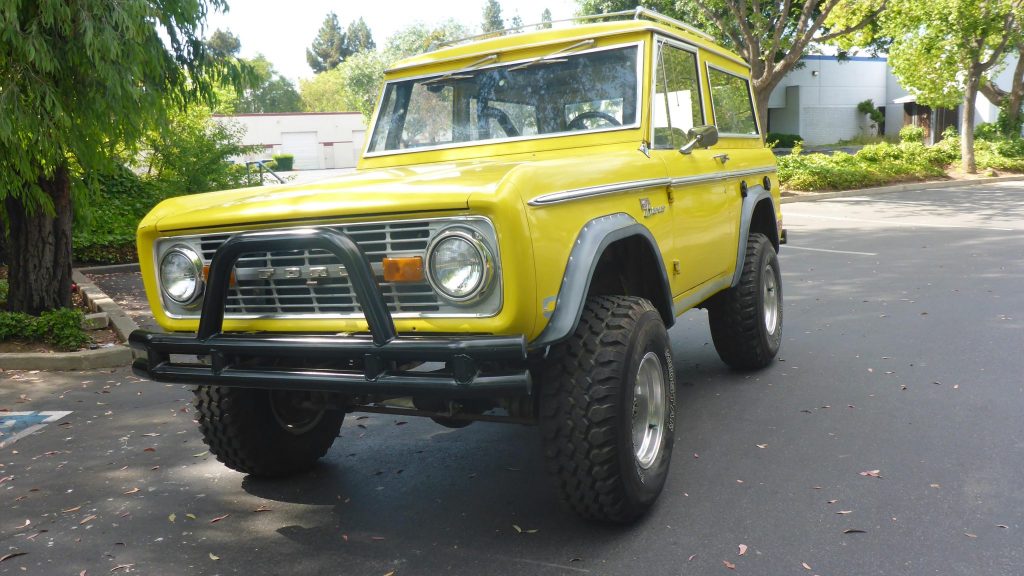 This 1969 Ford Bronco is finished in yellow over white vinyl and is powered by a 302ci V8 paired with a three-speed manual transmission and a dual-range transfer case. Equipment includes aftermarket wheels, aftermarket bumpers, wheel arch flares, a suspension lift, a roof rack, and a roll cage. The seller acquired the truck in 2001, and recent service is said to have included refreshing the braking system, rebuilding the carburetor, and replacing the tires.