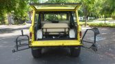 The body was repainted in yellow during previous ownership and features a removable hardtop with a polished roof rack. Additional exterior details include aftermarket bumpers, wheel arch flares, a receiver hitch, and a custom rear tire carrier with a Jerry can mount.