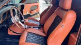 Sound-deadening material was reportedly applied in the cabin. The power-adjustable front bucket seats and folding rear bench are trimmed in orange leather with black quilted inserts, and matching upholstery adorns the doors and rear panels. Vintage Air climate control and power-operated windows were installed during the build along with a Sony head unit linked with aftermarket audio components.