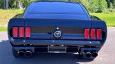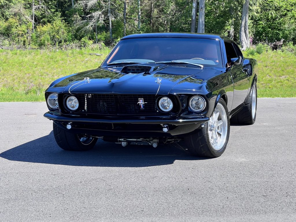 This 1969 Ford Mustang Mach 1 was refurbished and modified, with work including installing a 5.0-liter Coyote V8 and replacing and repairing body panels before a repaint in black. Power is routed through a Tremec six-speed manual transmission and a Currie 9″ rear end, and the car rides on Heidts adjustable coilovers and 17″ American Racing Shelby wheels over Wilwood discs. The cabin was reupholstered in orange and quilted black leather, and it is fitted with Vintage Air climate control, Dakota Digital gauges, and a Sony head unit linked with aftermarket audio components. Further equipment includes power steering, long-tube headers, MagnaFlow mufflers, and subframe connectors.