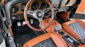 The floors and front fenders were replaced, bodywork was performed on the rear quarter panels, and the paint was stripped before the exterior was repainted in black during the build, according to the selling dealer. Replacement glass was installed, and exterior details include aftermarket headlights, driving lights, quad exhaust outlets, a hood scoop, and retaining pins.