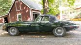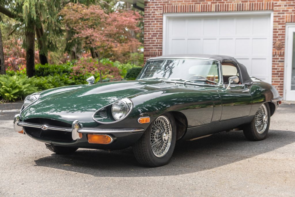 This 1969 Jaguar XKE is a Series II roadster that was built on September 15, 1969, and is said to have been purchased by the seller from its second owner in 2017 after approximately 15 years in storage. An ensuing refurbishment was completed in 2019. The car is finished in British Racing Green with a black soft top over red leather upholstery, and power comes from a numbers-matching 4.2-liter XK inline-six paired with a four-speed manual gearbox. Features include triple SU carburetors, an electronic distributor and ignition, an electric fuel pump, and air conditioning.