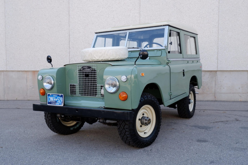 This 1969 Land Rover 88 is a left-hand-drive Series IIA ‘Bugeye’ export model that was initially delivered to Canada and was purchased by the seller in 2019. The truck has since undergone a cosmetic and mechanical refurbishment, with work said to have included rust remediation, repainting the exterior in green, refinishing the frame, an interior refresh, servicing of the 2.25 inline-four, and updates to the braking and suspension systems. Power is transferred through a four-speed manual transmission…