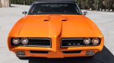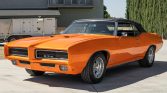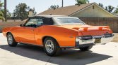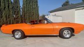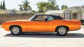 This 1969 Pontiac GTO convertible is finished in Tangelo Pearl over a black interior and is powered by a rebuilt 400ci V8 mated to a Muncie four-speed M20 manual transmission. Equipment includes a black soft top, 15” chrome wheels, a power antenna, air conditioning, and a factory stereo.