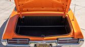 The body is said to have been refinished in House of Kolors Tangelo Pearl during the refurbishment and features a replacement black soft top. Exterior details include hideaway headlights, a chrome rear bumper, a power antenna, GTO badging, a rear spoiler, and polished trim and rocker panels. Work performed during the refurbishment included replacing the soft top hydraulic motor, cylinder, and lines in addition to installing Dickster Company mechanical electric hideaway headlights.