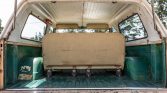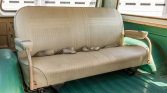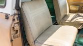 The cabin features front bucket seats and a rear bench trimmed in tan vinyl along with a matching dashboard and door panels. The exposed floor pans remain painted green, and amenities include air conditioning, a push-button AM radio, a locking glovebox, crank windows, and lap belts. Tears are visible in the driver’s seat upholstery.