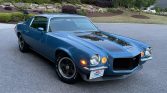 This 1970 Chevrolet Camaro Z/28 was refurbished in 2010 under previous ownership before it was acquired by the seller in 2019. The car is finished in Mulsanne Blue with black stripes over a black interior, and power comes from a 350ci V8 paired with a “Doug Nash” four-speed manual transmission and a 12-bolt positraction rear axle. Features include Rally Sport-trim, a rear spoiler, tinted glass, power front disc brakes, power steering, auxiliary gauges, sport mirrors, and an…