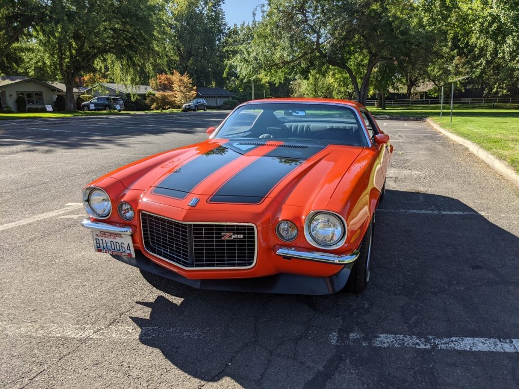 This 1970 Chevrolet Camaro Z28 was acquired by the seller approximately seven years ago and is finished in orange with black stripes over a black interior. Power comes from a numbers-matching 350ci LT1 V8 paired with a Muncie M21 four-speed manual transmission, and additional equipment includes front and rear lip spoilers, split chrome front bumpers, Z28 badging, and 15” alloy wheels. Recent maintenance has reportedly included a tune-up and oil change along with valve and steering box adjustments.