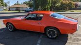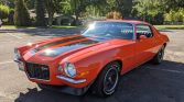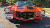 This 1970 Chevrolet Camaro Z28 was acquired by the seller approximately seven years ago and is finished in orange with black stripes over a black interior. Power comes from a numbers-matching 350ci LT1 V8 paired with a Muncie M21 four-speed manual transmission, and additional equipment includes front and rear lip spoilers, split chrome front bumpers, Z28 badging, and 15” alloy wheels. Recent maintenance has reportedly included a tune-up and oil change along with valve and steering box…