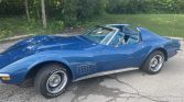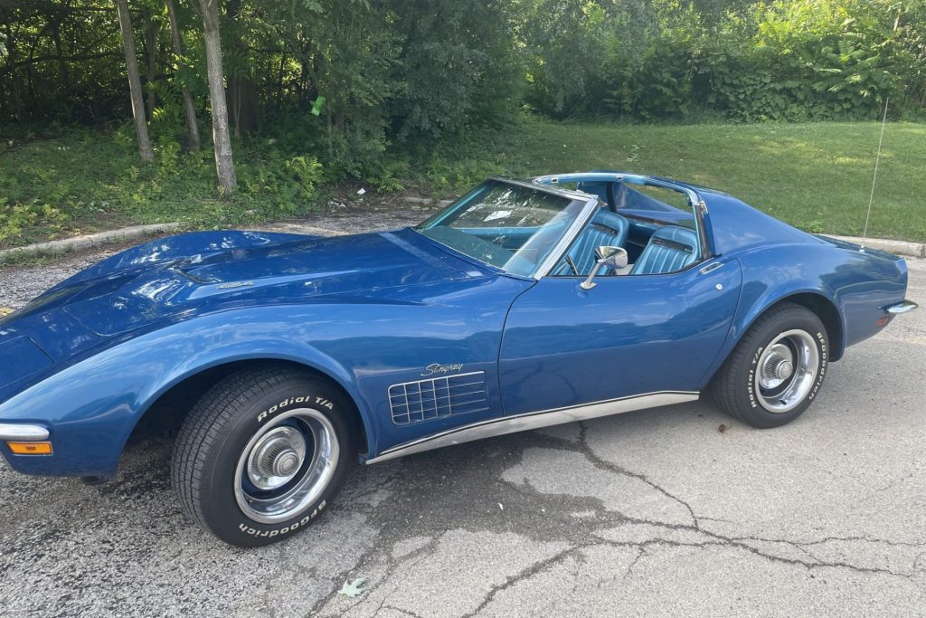 This 1970 Chevrolet Corvette is finished in blue over matching vinyl and is said to have spent approximately 27 years in storage prior to its acquisition by the seller in 2019. Power comes from a replacement 454ci V8 paired with an automatic transmission, and the car is equipped with a body-colored removable roof panel, pop-up headlights, and 15” Rally wheels. Work during current ownership has reportedly included replacement of the carburetor, intake manifold, thermostat, alternator, fuel pump, and spark plugs, along with the brake pads, calipers, and rotors.