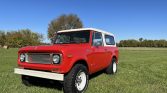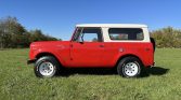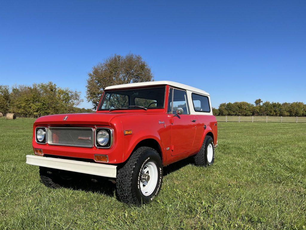 This 1970 International Harvester Scout 800A is a Traveltop 4×4 model that is finished in red with a white roof, and power comes from a 304ci V8 paired with a three-speed manual transmission and a dual-range transfer case. Equipment includes front bucket seats, front and rear lap belts, and aftermarket 15″ wheels with 31″ tires.