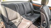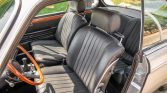 The cabin features bucket seats and headrests that were reupholstered in black leather during the refurbishment. A perforated white headliner was fitted, the woodgrain trim on the dash and doors is said to have been refinished, and a new turn signal stalk with windshield wiper switch was installed. Additional features include black carpets, power windows, and a retro-style stereo. The air conditioning system was serviced with a new compressor and converted to R134a.