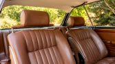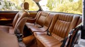 The cabin features seats upholstered in brown leather, and the matching carpets and beige headliner were replaced in 2016. Amenities include woodgrain trim, power windows, and an Alpine CD stereo with Morel speakers mounted in the doors. Components from the air-conditioning system have been removed.